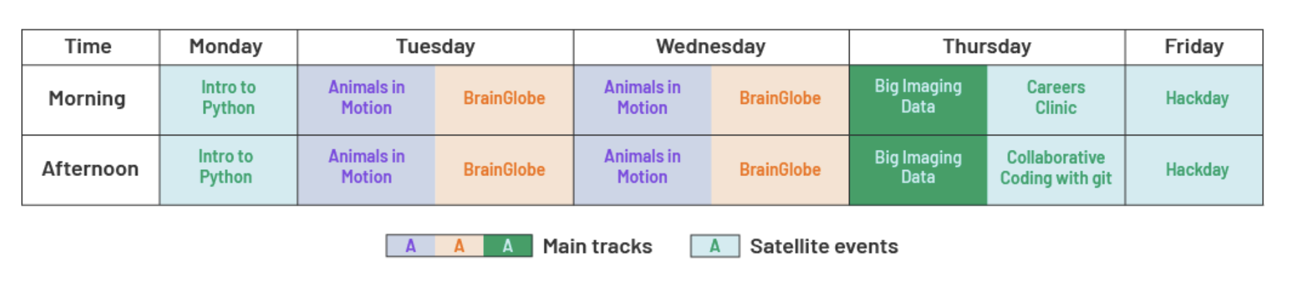 Attending tracks on different topics did not prevent our participants from making friends during the shared breaks and social events. The boundaries between our events were fluid and we were happy to see many engaging interactions: a participant switched tracks at the last minute, an Animals in Motion attendee helped with BrainGlobe problems during the hackday, and a few participants took time out of the Big Imaging Data event to attend the Careers Clinic.